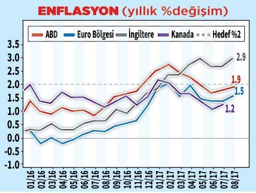 Gelişmiş ülkeler ekonomi-lerinde, kriz sonrası normalleşme, destekleyici para politikaları eşliğinde devam ediyor. Gelişmiş ülkelerdeki enflasyon baskısı son dönemde toparlanmaya başladı. Akbank, Bloomberg, FT ve Goldman Sachs kaynaklı aşağıdaki grafikler, gelişmiş ülkelerdeki enflasyon ve ücret seviyelerini gösteriyor. Gelişmiş ülke merkez bankaları, yıllık enflasyonu % 2 seviyelerine yükseltmek istiyorlar. Şimdiye kadar, sadece İngiltere bu hedefi tutturabildi. Amerikan Merkez Bankası FED, faiz yükselterek bu seviyeyi yakalamak istiyor. Aksi takdirde, daha önce piyasaya verdiği parayı geri almakta zorlanabilecek.